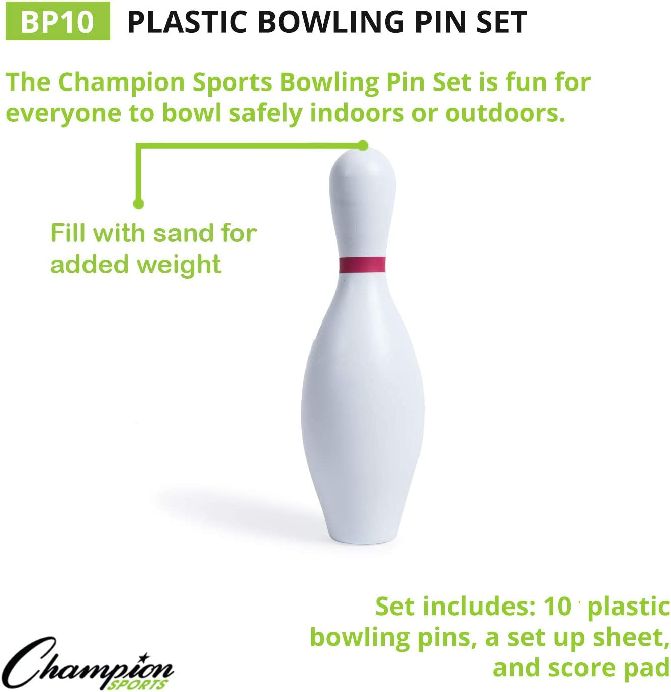 - 10 PIN BOWLING - Champion Sports Plastic Bowling Pin set features ten white pins, the number used by the pros; buy bowling pins and balls for school physical education classes or the recreation room